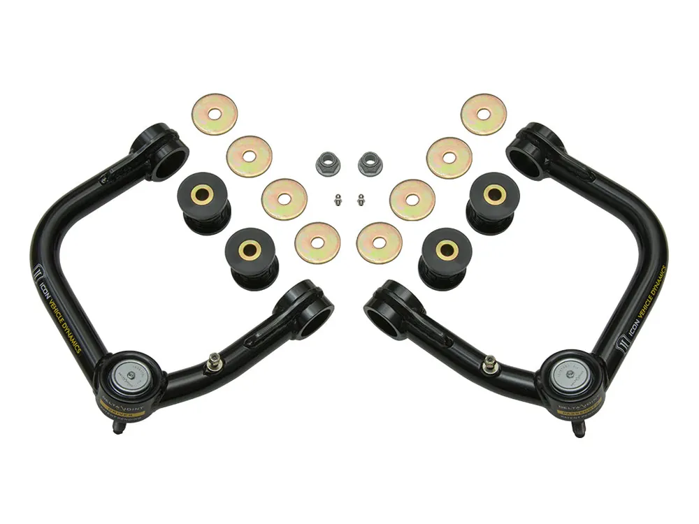 Take the performance of your 2005-2023 Toyota Tacoma to new levels with the ICON Vehicle Dynamics Delta Joint tubular upper control arm kit. All ICON tubular upper control arms are constructed from CNC bent 1026 DOM steel tubing and then powder coated to a semi-gloss black finish for maximum strength and corrosion resistance. ICON upper control arms are engineered with built-in caster correction for optimal alignment specifications and confidence inspiring handling. A main benefit of ICON upper control arms is the potential for increased wheel travel when paired with our extended travel coilovers, this translates into superior performance and ride quality for your 2005-2023 Toyota Tacoma. These upper control arms feature ICON’s patented Delta Joint. The Delta Joint is a heavy-duty high angle ball joint that combines the durability of a ball joint with the performance characteristics of a traditional uniball. While the industry standard uniball does a great job of allowing the control arms of a vehicle to articulate with little bind, they do have an inherent weakness that leaves more to be desired when used in a daily driven application – exposure to the elements. The Delta Joint features a zinc plated housing providing the first layer of corrosion resistance, while a tough grease seal keeps potentially harmful elements out of the inner workings of the joint. Metal on metal construction and a greaseable design increase the longevity of the Delta Joint while at the same time allowing for noise-free operation. What makes the Delta Joint unique is that it brings the best of both worlds to ICON upper control arms with features that make it more robust than a uniball, and at the same time capable of greater angularity than a typical ball joint.
