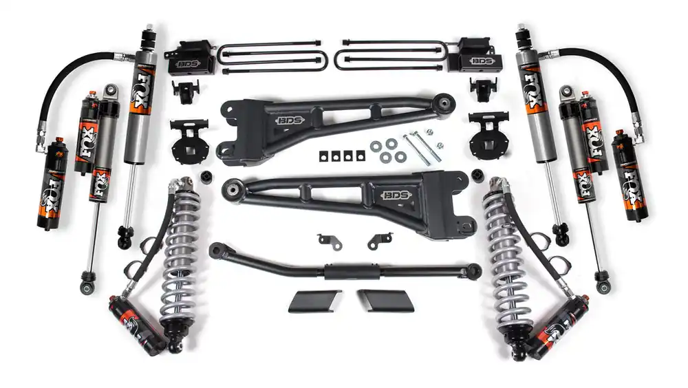 Build the ultimate 2023-2025 Ford F450 Super Duty diesel powered truck with this 2.5-inch radius arm lift kit with FOX 2.5 Performance Elite coil-over shocks from BDS Suspension. Designed to improve stance, performance, and capability, this kit includes everything necessary to set your truck up right with clearance for up to 35″ tires.
