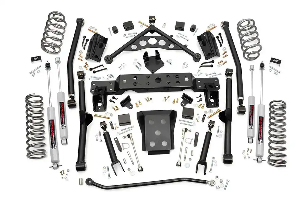 The kit includes adjustable high-clearance X-Flex upper and lower control arms with Clevite bushings, featuringX-Flex joints. The kit also includes front and rear coil springs, a front adjustable track bar with drop bracket, 1/4-inch thick steel crossmember, skid plate and sway bar disconnects. Outfitted with Rough Country’s N3 shocks, this Longarm Lift Kit is a total solution comprised of top-notch components designed for the avid off-roader who wants the most out of their WJ.
