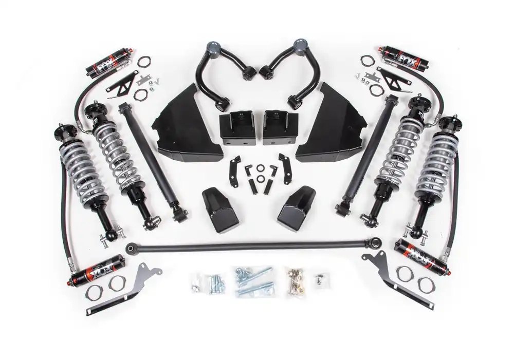 Up front the lift kit includes FOX 2.5 Performance Elite Series remote reservoir coil-over shocks, heavy duty tubular upper control arms for increased strength, steering tie rod sleeves to increase diameter or stock tie rods, max tire clearance kit to fit 37â⬠tires and lower control arm skid plates for the ultimate protection. In the rear, BDS utilizes a complementary set of FOX 2.5 Performance Elite coil-over shocks for an improved ride, -rear lower tubular control arms to give max flex, adjustable rear track bar to keep everything aligned, and a set of lower shock skids to prevent damage from rocks or debris.