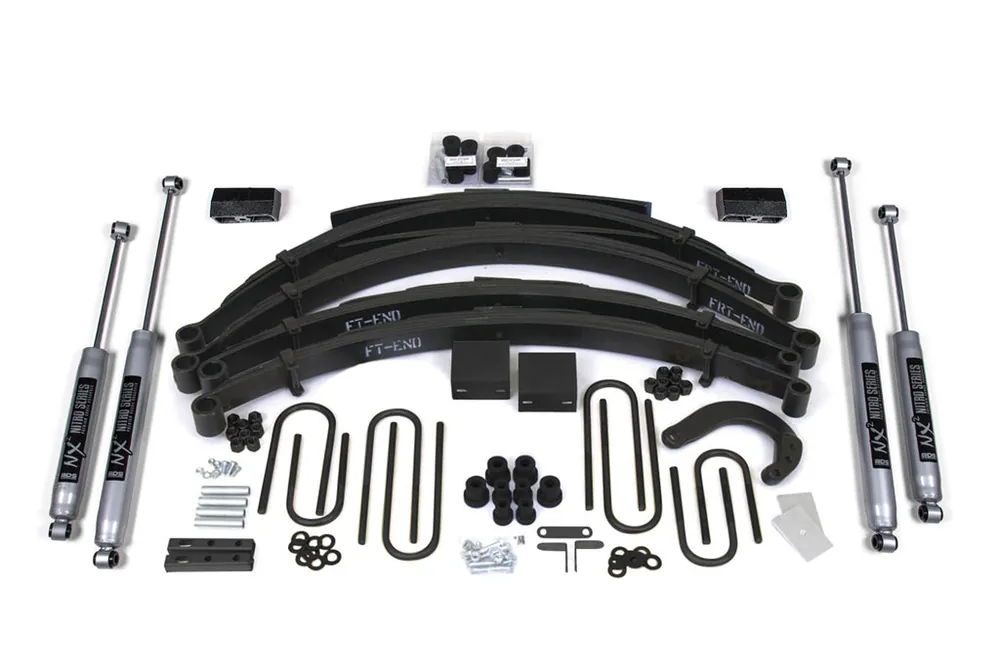 Up front the lift kit includes Glide-Ride leaf springs, 4″ steering arm and 3″ steering block for steering correction, brake line brackets, sway bar drop brackets and precision tuned NX2 nitrogen charged shocks. In the rear this kit utilizes a set of Glide-Ride leaf springs for the ultimate performance on and off road, new u-bolts and a matching set of NX2 Nitro shocks.