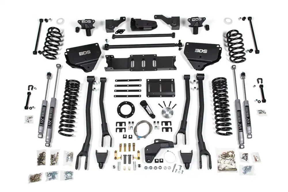 Go big with the BDS Suspension engineered 8-inch lift kit with 4-Link conversion for your 2014-2018 RAM 2500 diesel powered truck. Designed to improve stance, performance, and capability, this kit includes everything necessary to set your truck up right with clearance for up to 40″ tires.