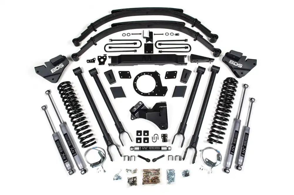 Take your Ford Super Duty diesel truck to the next level with this 9-inch 4-Link lift kit from BDS. Designed to improve stance, performance, and capability, this kit includes everything necessary to set your truck up right with clearance for up to 40″ tires.
