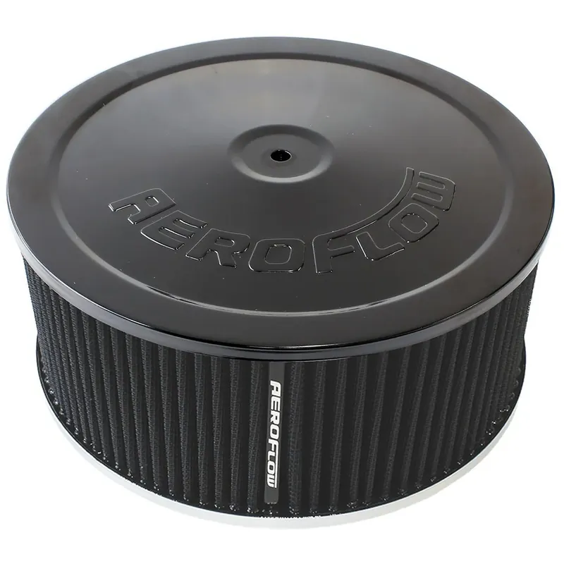 Stand out from the crowd with a magnificent looking Aeroflow air cleaner. These air cleaners are stamped from high quality steel. Available in many different great finishes and styles for that custom look you are after. Chrome-plated or black finish with reusable/washable or paper elements. Aeroflow air filter assemblies work with all popular standard 4150 (5-1/8″” / 130mm) carburettors and 4500 Dominator (7-5/16″” /186mm) carburettors. The 14″” (355.60mm) air filter assemblies come with a drop base that sits 1-1/8″” (28mm) below the carburettor.