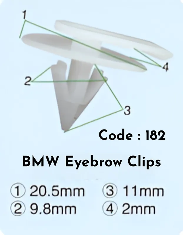 Precision-engineered eyebrow clips designed specifically for BMW vehicles. This comprehensive 10-piece set ensures you have replacements on hand for routine maintenance or repairs. Each clip features robust construction to securely hold components in place during assembly and disassembly. Compatible across multiple BMW models, these clips deliver reliable performance and durability. Ideal for both professional technicians and DIY enthusiasts who demand quality fastening solutions. Stock your workshop with this essential set today.