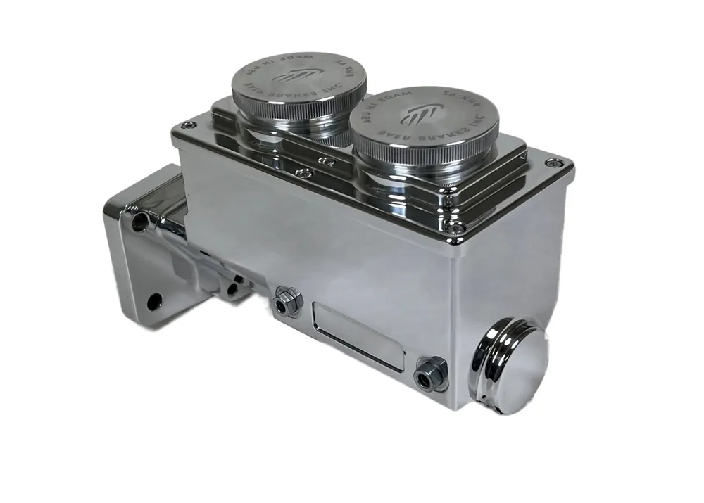 This Remaster master cylinder features a small, compact, 1-piece body machined out of 6061 T6 billet aluminum with a 1″ bore, right side ports and a 4-bolt mounting flange fitting many early Mopar applications. The billet top is attached with 6 allen screws and has two large billet aluminum, knurled screw-on caps making for easy filling without spillage. The unique outlet port design allows for either inverted flare (w/included removable seats) or banjo style, straight fittings. The Remaster is compatible on most long and short, w/included bullet, boosters or manual brake applications. Optional proportioning valves also available