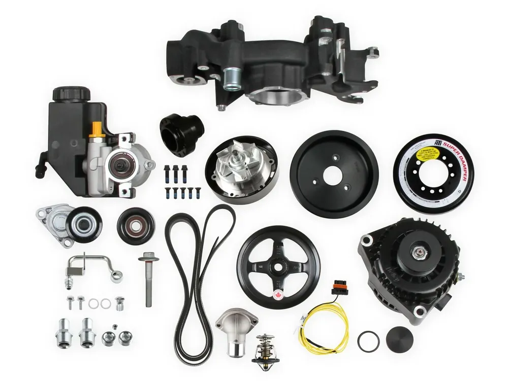 When we say “complete”, we mean complete. The Mid-Mount system comes with everything you need. All accessories are included; the water pump, Alternator, P/S pump with reservoir, and an SFI certified damper w/hard anodized billet crank pulley. All pulleys and the belt are supplied. Even heater hose adapters, power steering to -6 AN hardline, and the alternator plug/harness are included. Easy assembly was a priority during the entire development of this accessory solution. Color graphical instructions walk you through every step of the ultra-easy installation.