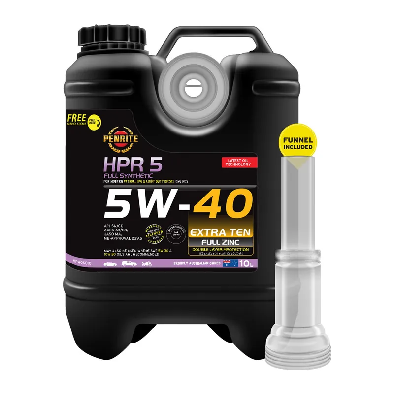 EXTRA TEN TECHNOLOGY HPR 5 features Penrite’s Extra Ten Technology in the oils operating temperature viscosity that provides better wear protection, oil pressure and reduced oil consumption at operating temperature. It provides an added layer of protection for engines that are under high load conditions, competition, operating in high ambient temperatures or showing signs of excessive oil consumption. VEHICLE & FUEL TYPES HPR 5 is suitable for use in passenger cars, 4WD’s, light commercial vehicles can be used in four stroke motorcycles that use a wet clutch system. It is compatible with Petrol/LPG (Dual Fuel)/E10 & Diesel and other conventional fuels. Can be used with E85 fuels for competition purpose. Penrite recommend changing the oil more regularly if using E85 fuel.