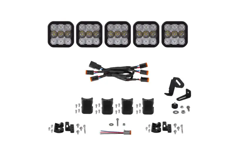 FeaturesFive-pod 31.5-inch linked lightbar Engineered TIR (total internal reflection) optics Selectable backlight color, with eight color options Torture-tested, heavy-duty construction Ultra-high intensity: shines almost a mile away Assembled in USAOverview Using our patent-pending CrossLink technology, this kit links five SS5 LED pods together into a single lightbar. Featuring the highest output intensity of any 5-inch LED pod on the market, the LED pods included in this kit have been designed for maximum functionality, with custom-engineered TIR optics, all in a durable package. Focused. Traditional optics like reflectors or simple lenses lose light internally and to glare, so not all of the light shines on target. Instead, the custom-engineered TIR optic in the SS5 collects all of the light from the LED, and directs it only where you need it, drastically reducing glare and improving total efficiency. Selectable Backlight. The Stage Series 5inch LED Pods included in this kit feature a selectable backlight with eight different color options. Selecting your backlight color is easy – simply alternate the power on and off. There’s no complicated programming with a controller! The SS5’s backlight fully illuminates the TIR optic, providing unique accent lighting that you won’t find on other LED pods. NOTE: Due to the yellow lens, the Yellow kit is only available with an Amber backlight color. Simple connections. All SS5 LED pods feature a custom-molded DT type Deutsch-style connector. A DT wiring harness is included in the kit to connect the pods together, along with a 6-inch pigtail with bare leads. For installation, you can wire yourself, use an off-the-shelf Deutsch DT sized wire harness, or use a Diode Dynamics wire harness.