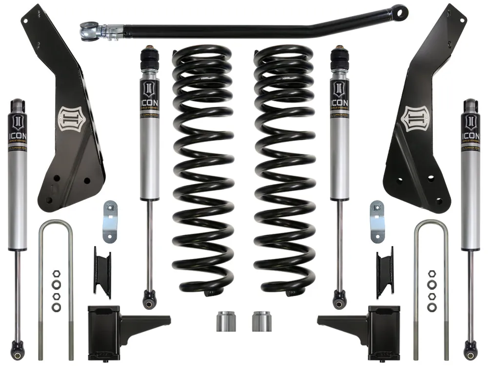 This 4.5″ System for the 2011-2016 Super Duty is one of the best riding suspension systems ICON has ever developed. This system has been engineered using the highest quality materials and components. The dual rate front coil springs combined with our ICON 2.0 Aluminum Series shocks give these trucks the performance they so desperately need. This system comes complete with front coils, shocks, radius arm drop down brackets, rear blocks, U-bolts, and our patented adjustable track bar giving the front end of these trucks perfect track alignment.