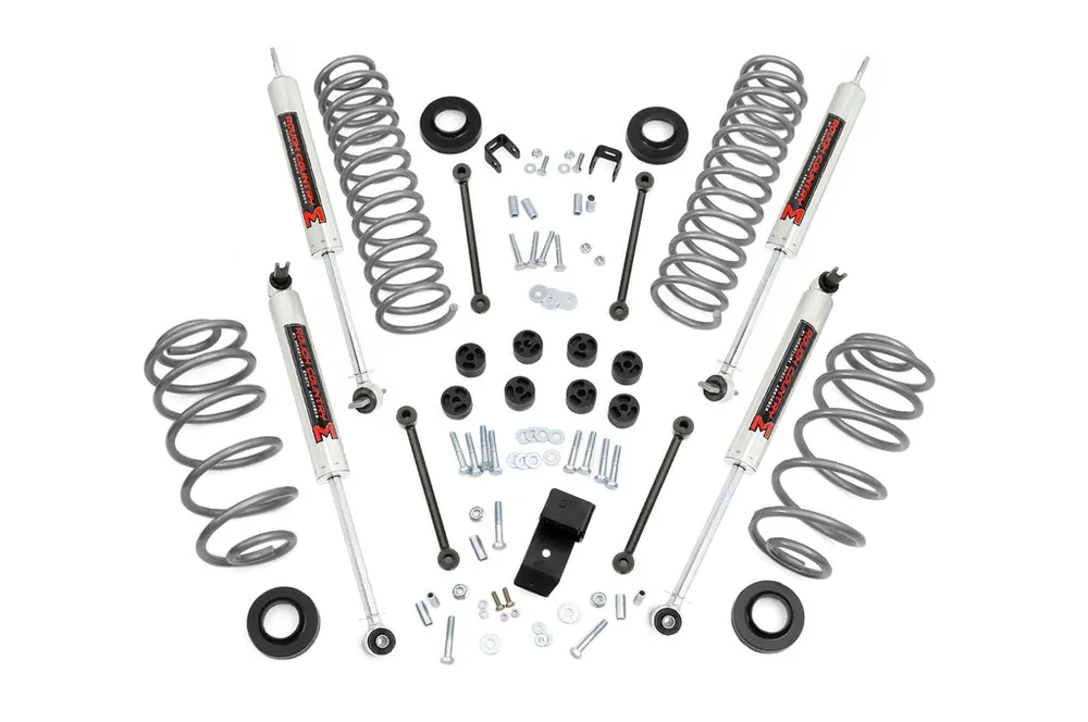 Looking to enhance your JeepΓÇÖs off-road capabilities without compromising on highway comfort? The 3.25-inch Lift Kit by Rough Country delivers just thatΓÇöa perfect blend of rugged performance and smooth driving. Designed for easy installation and built for adventure, this kit will elevate your Jeep to new heights, both literally and figuratively!Effortless Bolt-On Installation: No need for complicated modificationsΓÇöinstallation is quick and hassle-free, so you can hit the trails sooner.Enhanced Ground Clearance: Gain extra height to conquer uneven terrain and improve off-road performance, giving you the edge on tough trails.Perfectly Leveling Your Ride: Achieve a well-balanced stance with this lift kit, leveling the front and rear of your Jeep for a smoother and more stable ride.Rear Track Bar Bracket for Precise Alignment: Ensure perfect rear axle alignment with this essential feature, improving handling and boosting overall stability, especially on rugged trails.Configurable Shock Options: Choose your ideal ride quality with customizable shock options, including nitrogen-charged N3 or M1 Monotube shocks. Take control of your JeepΓÇÖs comfort and performance.This 3.25-inch Lift Kit comes complete with application-tuned, lifted coil springs, a transfer case drop kit, track bar bracket, and extended sway bar links, giving your Jeep everything it needs for enhanced off-road performance. Engineered by Rough CountryΓÇÖs Research and Development Team, this lift kit is designed for drivers who demand both performance and comfort from their vehicle.