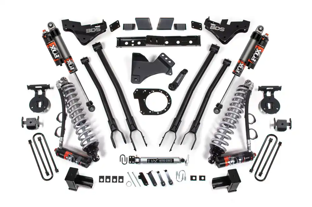 Raise the bar on your Ford Super Duty diesel truck with this 7-inch 4-Link lift kit and FOX Performance Elite coil-over conversion from BDS. Designed to improve stance, performance, and capability, this kit includes everything necessary to set your truck up right with clearance for up to 38″ tires.