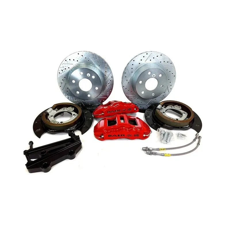 The Extreme system comes with the 1-piece Monoblock 6-piston, 6S caliper mounted to a 14″, 1 piece slot only rotor. The 6S caliper is fully machined in Phoenix, AZ from a US sourced 2618 Aluminum forging, includes stainless steel pistons and abutments, D.O.T. compliant dust and weather seals and uses the popular D1247 pad type. Baer’s unique backing plate not only acts as a caliper mount, but also houses a modern 1-piece park brake shoe assembly. Stainless braided hoses and hardware are also included. The 14” Extreme fits most 18” or larger wheels.