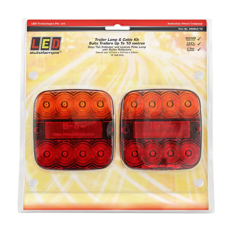 LED Autolamp’s Trailer Lamp and Cable Kit, fetures stop/tail/indicator lamp with licence plate lamp, contains 10m cable in 12 volt only. Blister pack containing left and right lamps.
