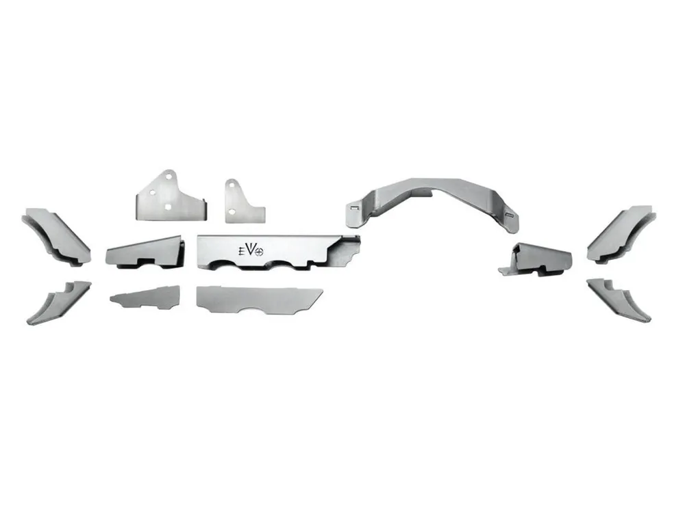 The JK Front axle is prone to bending causing a costly replacement. The EVO MFG JK ProTek Front Axle Truss is specifically designed to give the axle ample strength to prevent deflection. Manufactured from 3/16” Laser cut steel and CNC press brake formed one piece sections that minimize excess heat and weld shrinkage which ensures a truer axle after install. Less heat, less chance of axle warping and easier install. Integrated 3/16” steel backbone through center of main truss sections collectively add to 9/16” total backbone bracing. Secondary ¼” steel differential bridge connects left and right truss sections over cast differential center section giving a extremely strong one piece integrated truss system covering the entire axle end to end.Secondly the differential bridge allows for no need to weld to the differential casting which requires a specialty welding process for proper adhesion.This kit comes complete with EVO MFG JK ProTek Front Axle Truss and EVO MFG C2 Axle Gussets which complete the axle bracing all the way down to the axle end forgings commonly known as the axle C’s.
