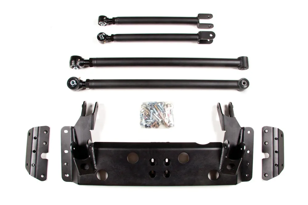 The system includes upper adjustable flex long arms that utilize the factory rubber bushings at the axle mount and lower adjustable flex long arms with rubber ends at the axle for maximum driver comfort and reliability. The control arms are equipped with BDS Gen II forged flex eyes to allow for maximum articulation. Additionally, the system includes a complete control arm mounting system with a belly pan.