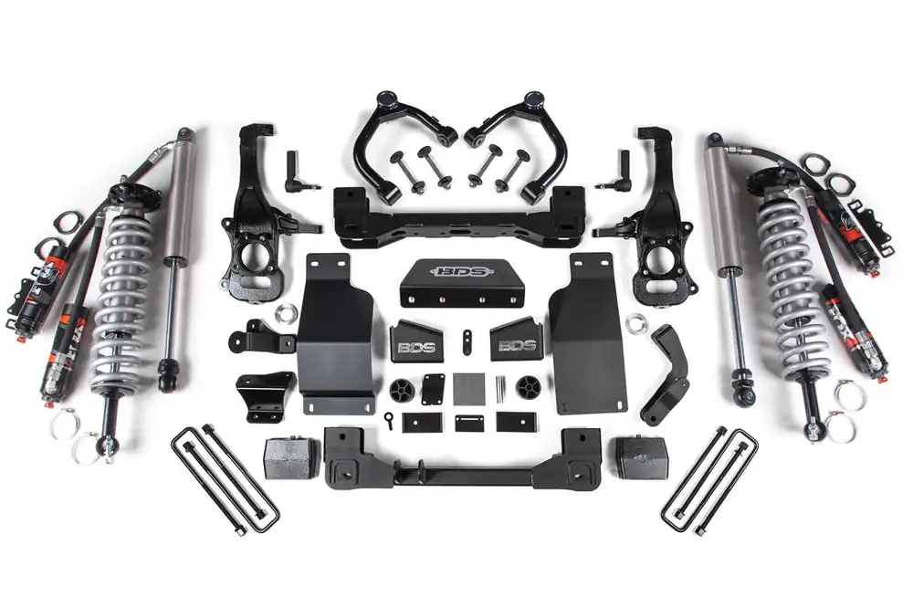 Up the ante in performance with your Chevy Silverado and GMC Sierra 1500 truck by installing the BDS 6-inch lift kit suspension featuring FOX 2.5 Performance Elite coil-over shocks. Designed to improve stance, performance, and capability, this kit includes everything necessary to set your truck up right with clearance for up to 35″ tires. These kits feature proprietary FOX 2.5 coil-over shocks designed specifically to bolt-on performance for increase travel and the ability to soak up the roughest terrain along with smooth on-road comfort.