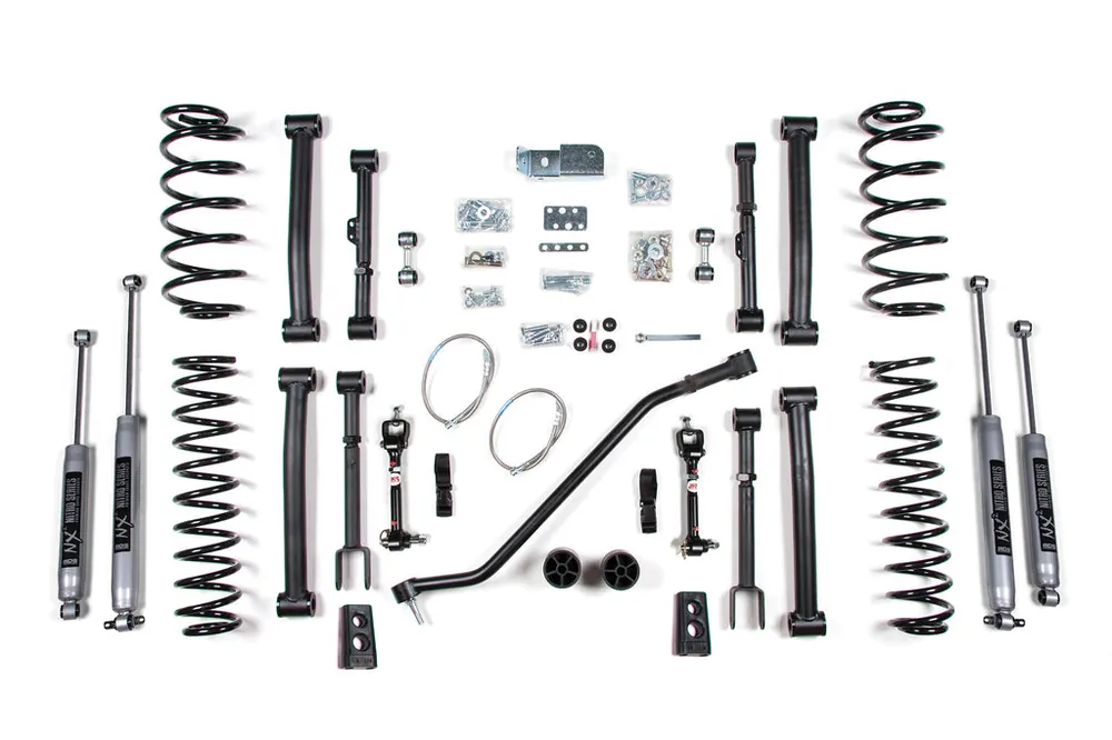 The rear kit utilizes Glide-Ride coil springs for maximum travel, stainless braided brake line, rear track bar relocation bracket, extended sway bar links, and heavy duty front upper adjustable and fixed length lower control arms. Finish of the kit with your choice of specially tuned NX2 nitro series gas shocks or FOX 2.0 IFP performance series gas shocks to offer improved damper performance.