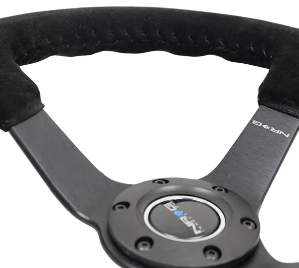 Must Have NRG Reinforced Steering Wheel (350mm / 3in. Deep) Blk Suede/Blk Bball Stitch w/5mm Matte Black Spoke