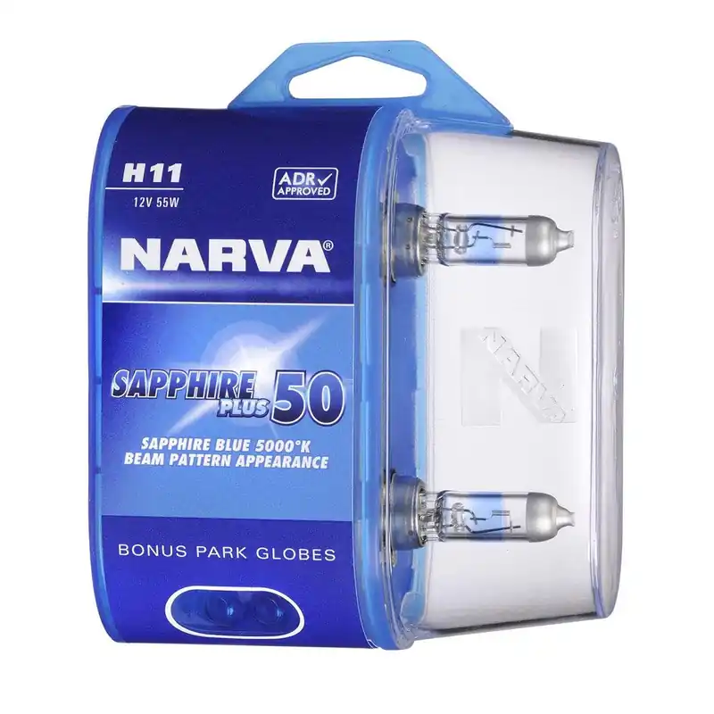 H11 12V 55W SAPPHIRE PLUS 50 HALOGEN HEADLIGHT GLOBES (BL2). Using revolutionary new filament technology the sapphire Plus 50 provides a light output of up to 5000°K. When other road users look at a headlamp with Sapphire Plus 50 globes installed, theappearance is an eye catching sapphire blue colour providing a truly premium look and increasing the visibility of the car. From the driver’s seat the light appears much whiter and with 50% more light on the road makes driving at night easier.
