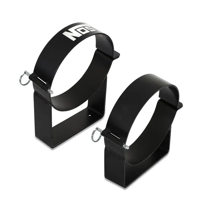 NOS brackets are designed to securely hold your nitrous bottle at the proper angle for maximum flow through the siphon tube. These quick release brackets allow you to change bottles in a snap. These lightweight, good looking aluminum brackets feature a black finish and laser etched NOS logo. Sold as a pair.