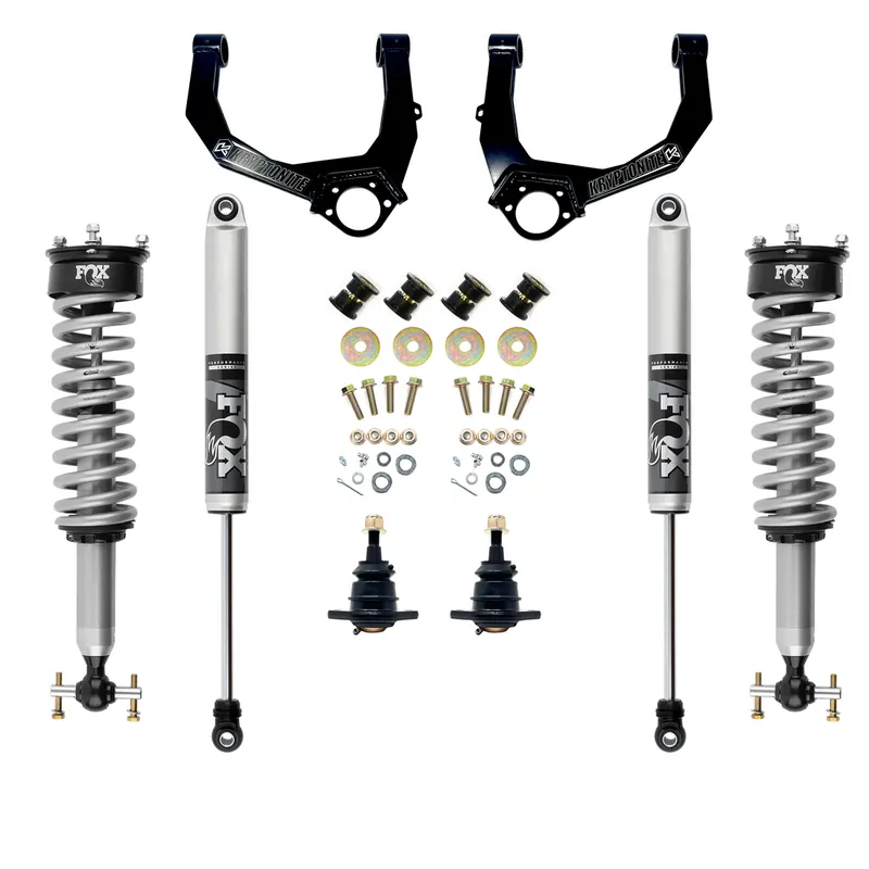 This Leveling kit includes everything you need to lift the front of your truck 2″ and provides a great ride. Kit includes Fox Performance Series 2.0 Coilover Shocks pre-set at 2″ above stock ride height. Plus Fox Performance Shocks for the rear of your truck. To allow for suspension travel we have included Kryptonite Upper Control arms. These arms are laser cut and welded into an extremely strong boxed design. Made with pride here in small town USA and backed with a Lifetime Warranty.