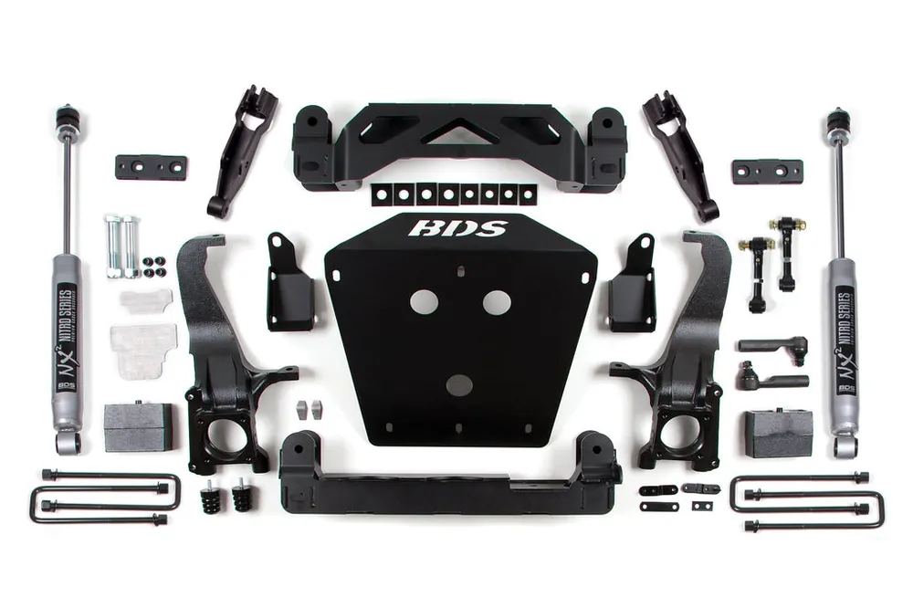 This kit takes advantage of BDS’s tried and true high-clearance design for improved ground clearance, strength, and offroad protection while correcting suspension and steering geometry for great on-road handling characteristics. Up front, the kit utilizes a lower strut extension, high-arched 1/4-inch thick steel crossmembers along with a multipiece differential relocation brackets and heavy duty skid plates built for offroad protection. Steering geometry is corrected at the new taller ride height with CNC-machined ductile iron steering knuckles utilizing replacement tie rod ends allowing for ESC system compatibility. These combined with the provided sway bar drops, bump stop extensions, brake line brackets, supplied hardware and more provide a comprehensive front suspension lift ready for whatever you throw at it.
