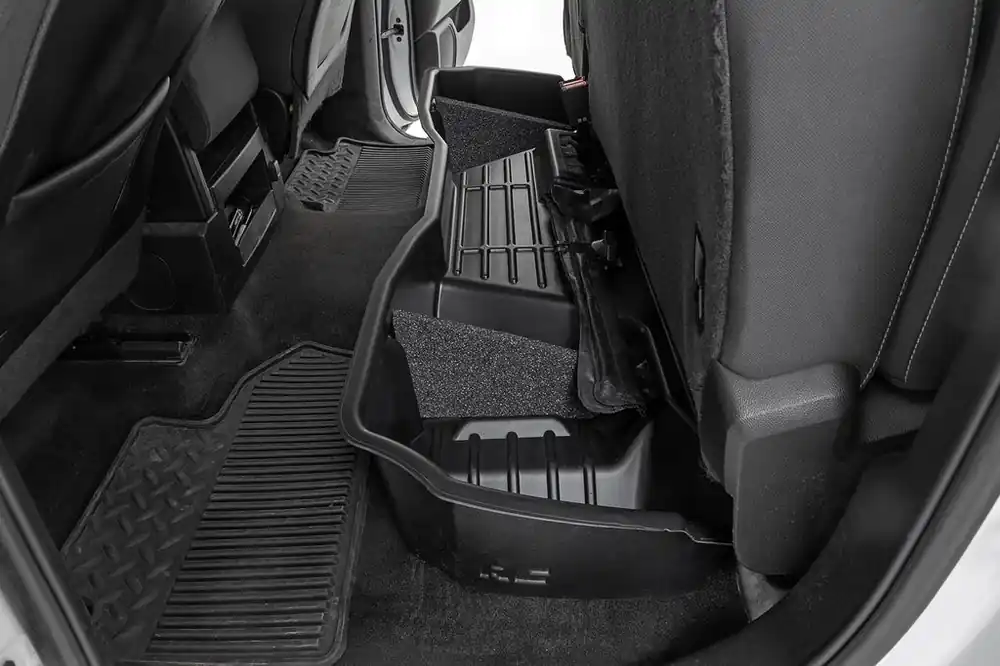 Clean up the contents of your cab with Rough CountryΓÇÖs Custom-Fit Under Seat Storage Compartment. These handy underseat truck storage compartments offer an easy way to store your gear with a custom, contoured look that blends in seamlessly with your vehicleΓÇÖs factory design. Keep your tools, gear, and other odds and ends organized and stowed away while conveniently stowed away under the rear seats.\\Each under-seat storage tray is constructed from a durable, high-density thermoplastic material thatΓÇÖs built to withstand kicks, nicks, and corrosion. A convenient anti-skid surface helps prevent the contents of your underseat cargo tray from rolling around while driving. Best of all, Rough CountryΓÇÖs Custom-Fit Under Seat Storage Compartments are easy to install, so you can upgrade your cargo management quickly and easily!