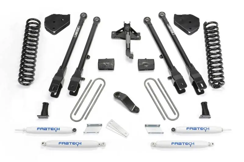 Fabtech?s 6? 4 Link Conversion system for the Ford F450 and F550 Super Duty is built to handle the on and offroad demands of the truck enthusiast.2? OD Heavy wall link arms have 1/4? thick steel brackets at the axle with adjustable alignment cams and Fabtech?s legendary 5 Ton joints to pivot at the frame for an extended service life.The 4 Link Arms attach to stout 1/4? thick steel frame brackets for a solid mounting of the new suspension.American made coil springs have been designed for a very compliant ride quality both on and offroad.1/4? thick steel bracketry repositions the factory track bar to center the axle under the vehicle with the increased lift height. Super stout box style bracket is designed to eliminate deflection when the track bar moves through its full cycle.The Dropped Pitman Arm uses forged steel construction with high strength material that exceeds the factory specifications.Heavy duty 1/4″ thick steel brackets control the travel eliminating over cycling of the suspension. Super strong construction can handle the full compression impact of the F450 or F550.1/4″ thick steel drop brackets reposition the front sway bar for the increased ride height. This allows the sway bar link ends to fully cycle without binding throughout the extended travel range.Brake Line Brackets reposition the factory brake lines down on the frame for the new travel range without having to open the brake system.Retains the factory F450 or F550 long travel steering stabilizer with a 1/4″ thick steel bracket and support brace to help reduce tire shimmy.Steel rear lift blocks replaces the factory blocks for additional lift without changing the ride quality or load carrying capacity.American made U-Bolts designed to attach the entire rear differential to the vehicle.Extended length Performance twin tube shocks provide a good highway ride with the ability to handle offroad use.
