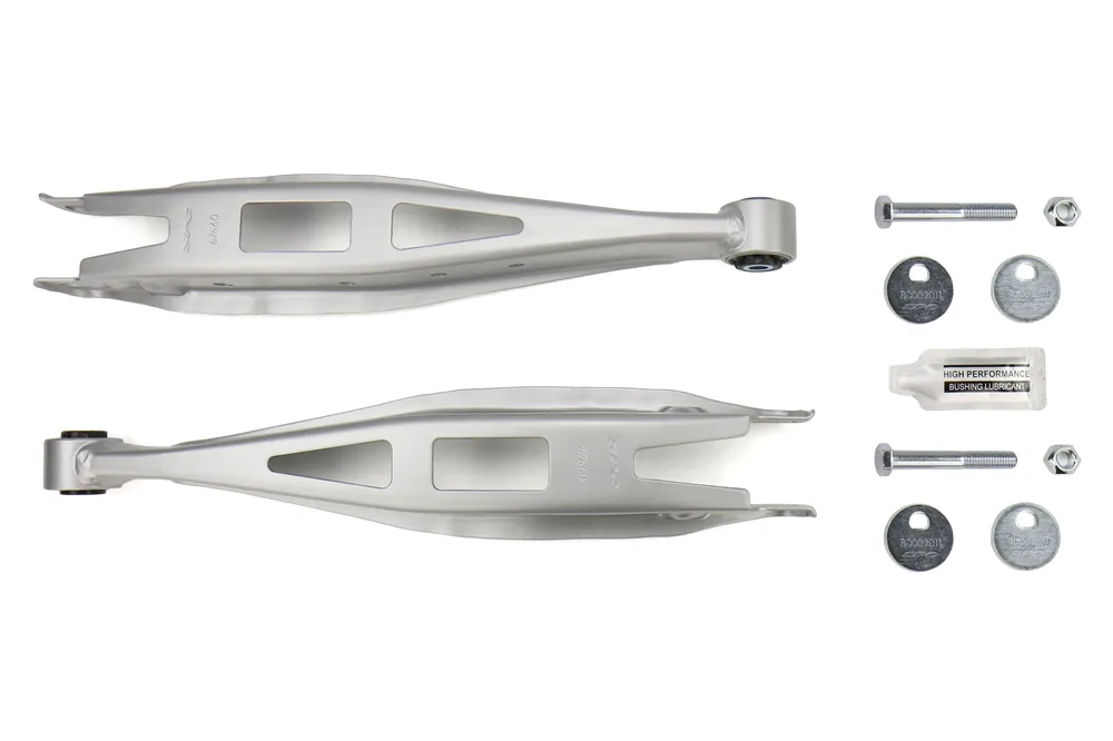 Adjustable lower control arm of the Subaru Impreza STI / WRX, Scion FR-S, and Subaru BRZ feature a light weight (3.8lbs per complete arm) stamped steel design. Adjusts via a cam bolt at outboard and an eccentric bushing at inboard position to provide adjustment from both ends for in-field adjustment versatility. Provides +/- 2.5 deg of camber range.