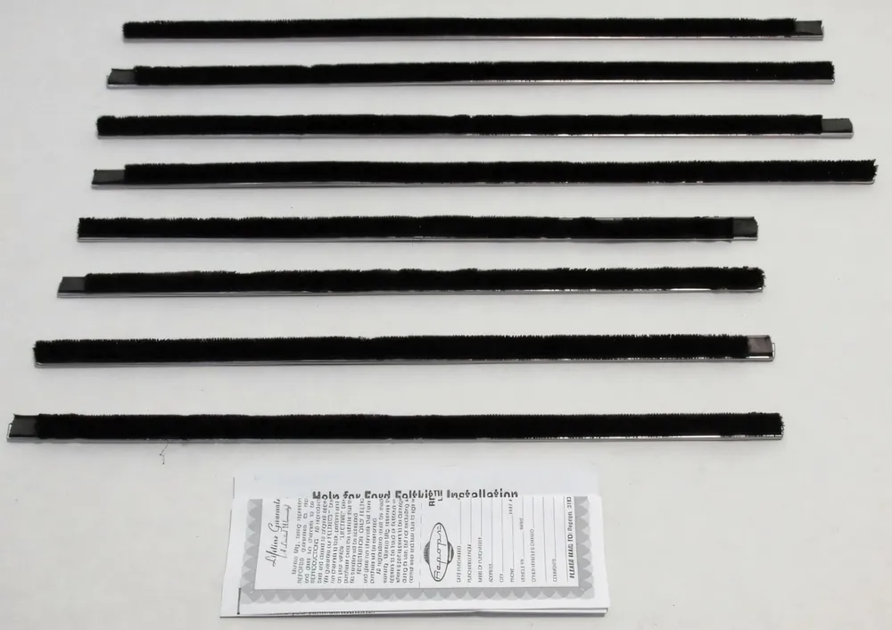A window sweep kit is a set of replacement seals for classic car doors and windows. These sweeps help keep out water, dust, and wind while allowing the window glass to move smoothly. Replacing worn sweeps restores proper sealing, reduces interior noise, and protects door panels from moisture damage.